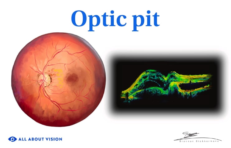 An optic pit is a small hole or opening on the optic disc, which joins the eye to the optic nerve (the nerve that connects the eye to the brain). They don’t always cause symptoms or vision impairment, but they can lead to damage over time by causing fluid to accumulate in places it shouldn’t be.