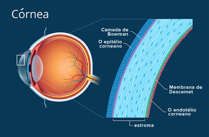 A córnea tem cinco camadas. Da parte anterior para a posterior, essas camadas são: